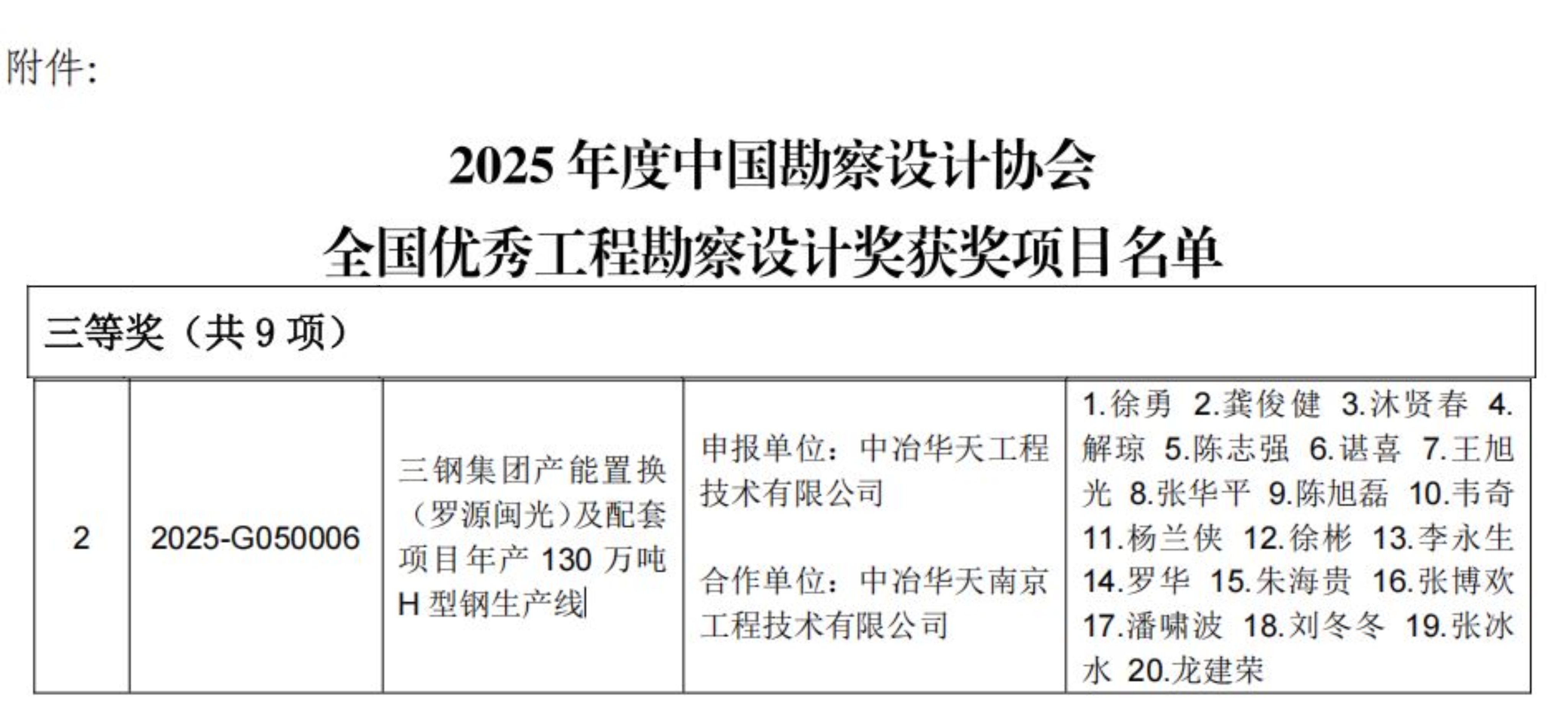 The China Outstanding Engineering Survey and Design Award, organized by the China Exploration & Design Association, is one of the highest honors in China's engineering survey and design sector. Through a rigorous multi-stage selection process including preliminary review by specialized panels, comprehensive evaluation by an expert committee, public announcement on the association's website, and final approval by the awards committee, the award establishes an evaluation system based on multiple dimensions such as innovative design value, effectiveness of cutting-edge technology application, and depth of cultural heritage preservation, aiming to select benchmark projects that represent the industry's most advanced standards. This year, a total of 1,477 projects received the 2025 industry awards, among which the Metallurgical Industrial Engineering Design category awarded 4 first prizes, 7 second prizes, and 9 third prizes.