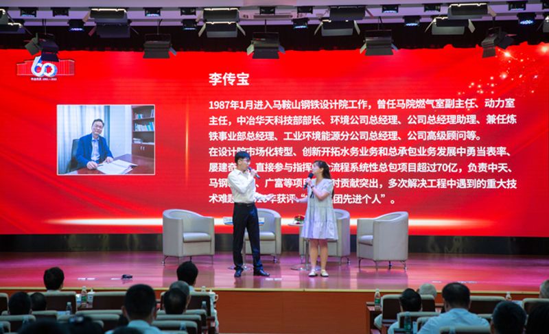 老一辈艰苦奋斗、开创基业的辛劳和成就感人泪下,三位公司老专家首先登台,在主持人的引导下,娓娓道来当年的光辉篇章。H型钢领域贡献突出的金持平,是国务院津贴获得者,他讲述了自己与设计H型钢生产线的不解之缘,特别是主持设计第一套国产H型钢生产线——马钢650轧机生产线、国内第一条大H型钢生产线——马钢H型钢生产线,助力公司成为H型钢领域设计排头兵,为我国H型钢发展奠定了基础;技术型经营人才周柏春,在江浙等区域经营贡献突出,返聘后助力公司成功中标中天南通精品钢基地精品棒材项目和220千伏总降变电站项目,他深情回顾了自己参与电力谐波滤波装置推广、冶金电力设计手册编写、福建三明钢厂第一条国产化棒材三电设计前期管理工作、区域市场开拓等的难忘经历;烧结专家许景利也是国务院津贴获得者,持续推动烧结厂“设备国产化”,分享如何领衔完成马钢300平方米烧结机工程“全套非标设备国产化”研究制造与建成投产,奠定了我国烧结厂设备大型化、国产化的基础。