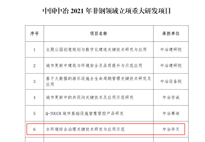 近日,从中冶集团获悉,由水环境分公司(水环境技术研究院)负责申报的《水环境综合治理关键技术研发与应用示范》课题,入选中冶集团2021年非钢领域重大研发项目,是二十大项目中仅有的两项水环境项目之一。