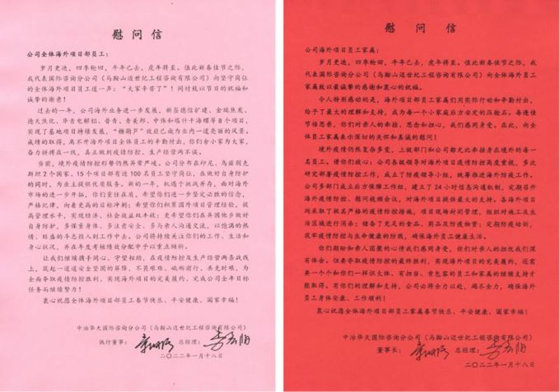中冶华天国际咨询分公司执行董事和分公司总经理代表领导班子向春节期间驻守现场的职工和家属分别发出慰问信,送去新春的祝福,感谢他们的辛勤付出和无私奉献,赞扬了他们勇于担当、不畏风险的奋斗精神,并希望他们同全体职工一道,继续守望相助、同舟共济,携手开创海外事业持续发展新局面。