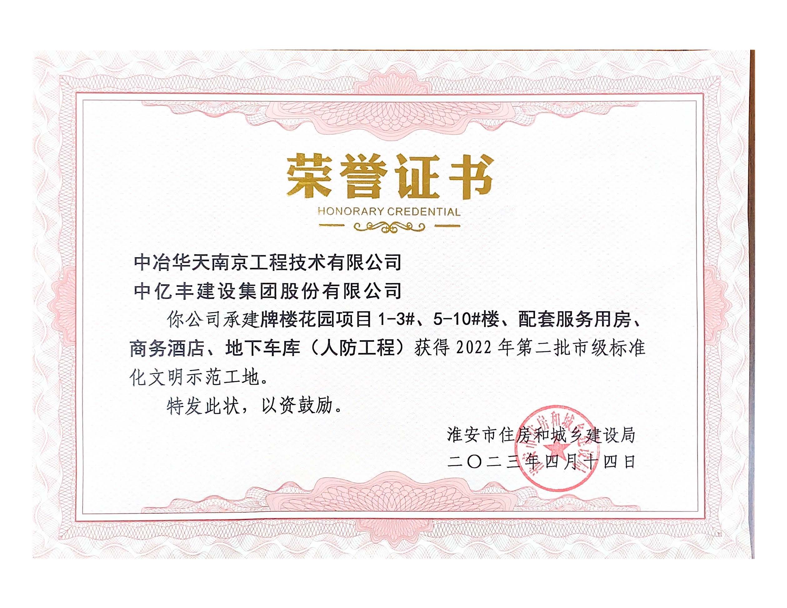 4月26日,中冶华天总承包金湖县牌楼花园工程总承包(EPC)项目收到了由淮安市住房和城乡建设局颁发的“2022年第二批市级标准化文明示范工地”荣誉证书,继淮安市和平镇和韵苑一期农民集中居住区项目、淮安市和平镇和韵苑二期农民集中居住区项目、淮安市和平镇和顺苑农民集中居住区项目后再获此殊荣,在苏北地区持续唱响“中冶华天,绿色明天”品牌之歌。