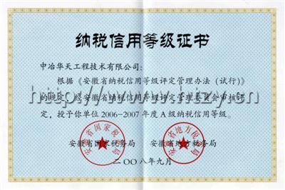 中冶华天一直秉承“依法纳税、主动纳税、诚信纳税”的理念,从各个层面、各个环节规范企业纳税行为,积极配合税务机关的税务检查,为税务机关的税收管理创造了良好的企业环境;同时税务部门也为中冶华天提供了优质税收服务,为企业依法诚信纳税创造了良好条件。获评这一荣誉既是对中冶华天2006年-2007年度诚信经营、依法纳税、贡献社会的充分肯定,也是对中冶华天的鼓励和鞭策,将为企业带来巨大的品牌价值。根据规定,A级信用企业在纳税检查、日常税收管理等方面将享有一定的优惠。