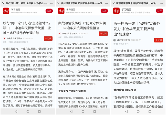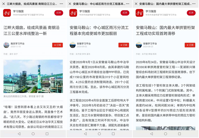 截至目前,2020年中冶华天已先后6次登上“学习强国”平台,除此次报道外,还有:《两手抓两手硬丨“硬核”实策齐发力中冶华天复工复产跑出“加速度”》(3月11日)、《频战汛情筑防线严防死守保安澜——中冶华天抗洪抢险显担当》(8月11日)、《践行“两山论”打造“生态福地”马鞍山——中冶华天探索传统重工业城市水环境综合治理之路》(8月24日)、《安徽马鞍山:国内最大单拱管桁架工程成功实现首跨滑移》(8月25日)、《安徽马鞍山:中心城区雨污分流工程基本完成使城市更加靓丽》(9月3日)等,报道内容涉及复工复产、抗洪抢险、践行“两山论”、典型项目等各个方面,全方位展现了公司的业绩成果和“党建强企,科技报国”的企业使命担当。