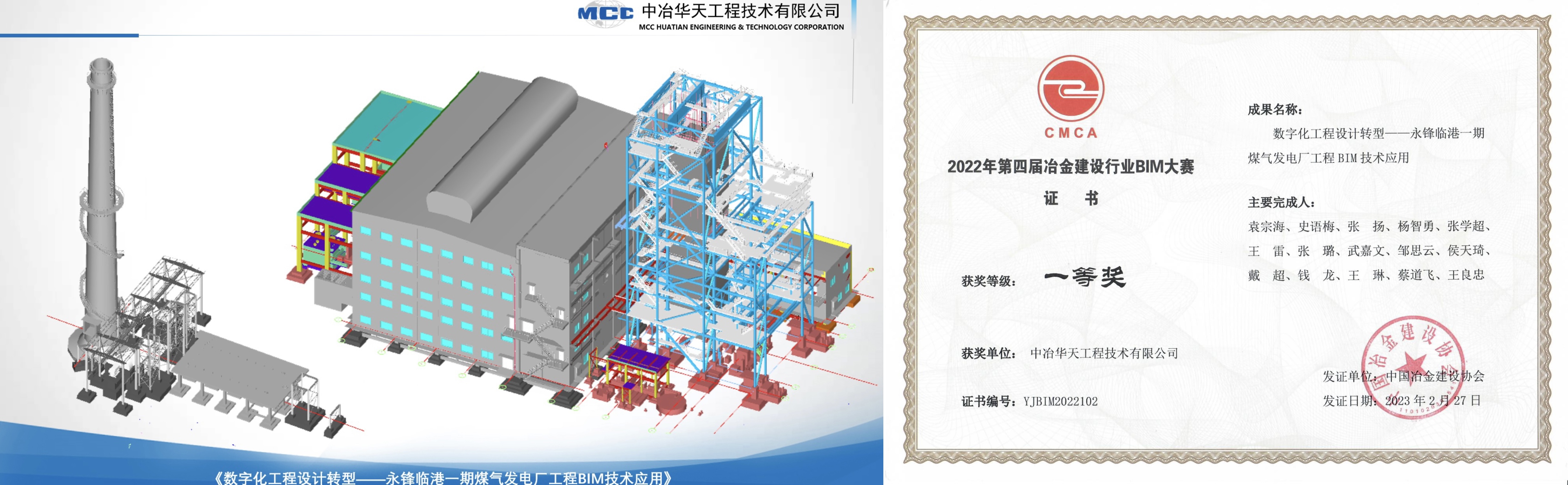 一等奖项目所依托的山东钢铁集团永锋临港先进优特钢产业基地一期项目是由中冶华天总体设计的长流程钢铁项目,作为该项目的重点配套设施,永锋临港一期煤气发电工程新建1套100MW超高温亚临界煤气发电机组。煤气发电项目设计团队充分发挥BIM技术优势,对设计各阶段的工作目标、工作重点、工作流程,以及质量要求、协同方式、交付内容等进行精细策划,基于云平台对全厂各专业进行在线校核和设计纠偏检查,确保设计全过程高效、精准,为提高施工质量和确保现场安全零伤亡提供了可靠的技术保障。项目投运以来,发电单耗稳定在2.62Nm3高炉煤气/千瓦时,达到同等机型全国最低高炉煤气单耗水平。该项目曾获中冶集团BIM设计大赛一等奖、江苏省勘察设计行业BIM应用大赛二等奖等。