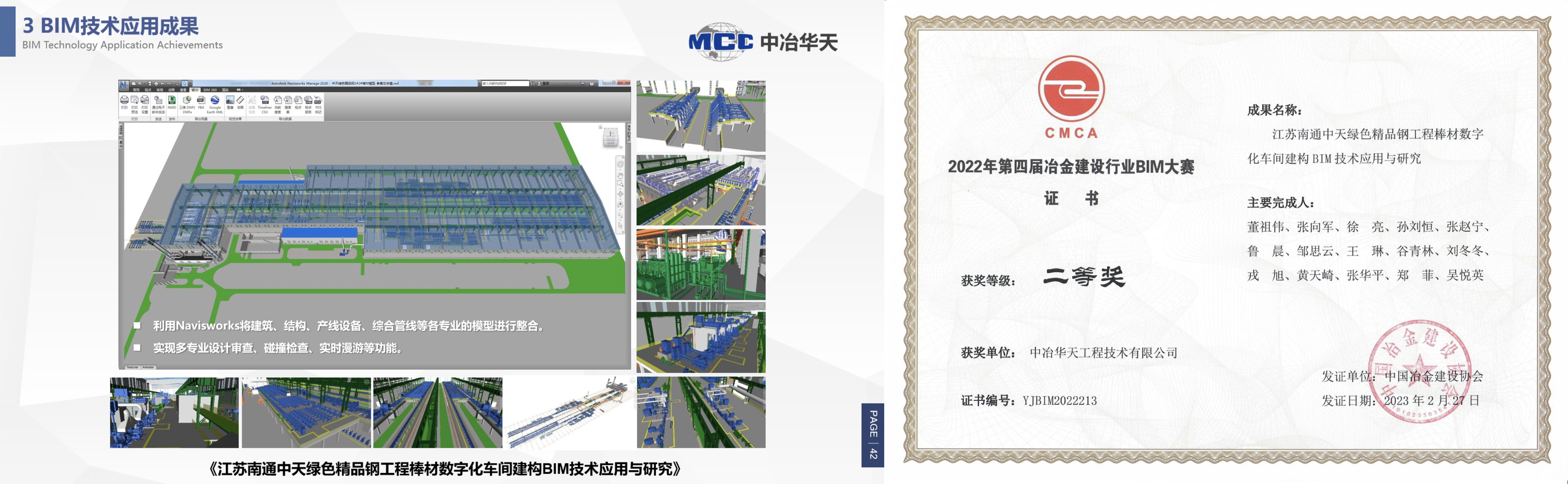 近日,2022年第四届冶金建设行业BIM大赛评选结果公布,中冶华天七个参赛项目全数获奖,其中,工业环境能源分公司的《数字化工程设计转型——永锋临港一期煤气发电厂工程BIM技术应用》项目获一等奖;钢铁设计研究总院的《江苏南通中天绿色精品钢工程棒材数字化车间建构BIM技术应用与研究》项目获二等奖;钢铁设计研究总院的《面向企业数字化转型的高炉车间BIM应用》和《基于BIM技术的烧结机设计研究及应用》项目、水环境分公司的《定远县炉桥镇污水处理厂一期工程BIM设计应用》和《BIM技术——水环境综合治理工程智慧“助推器”》项目、建筑设计研究院的《科沃路(创正路~北城大道)工程BIM应用》获三等奖。此次集中获奖,是对公司长期以来大力推动BIM技术应用的有力回报,代表了公司在钢铁冶金、环境环保、房建市政等多个业务板块的BIM应用成效,展现了公司在数字化发展上的决心与核心竞争力,再次擦亮“中冶华天,绿色明天”品牌。
