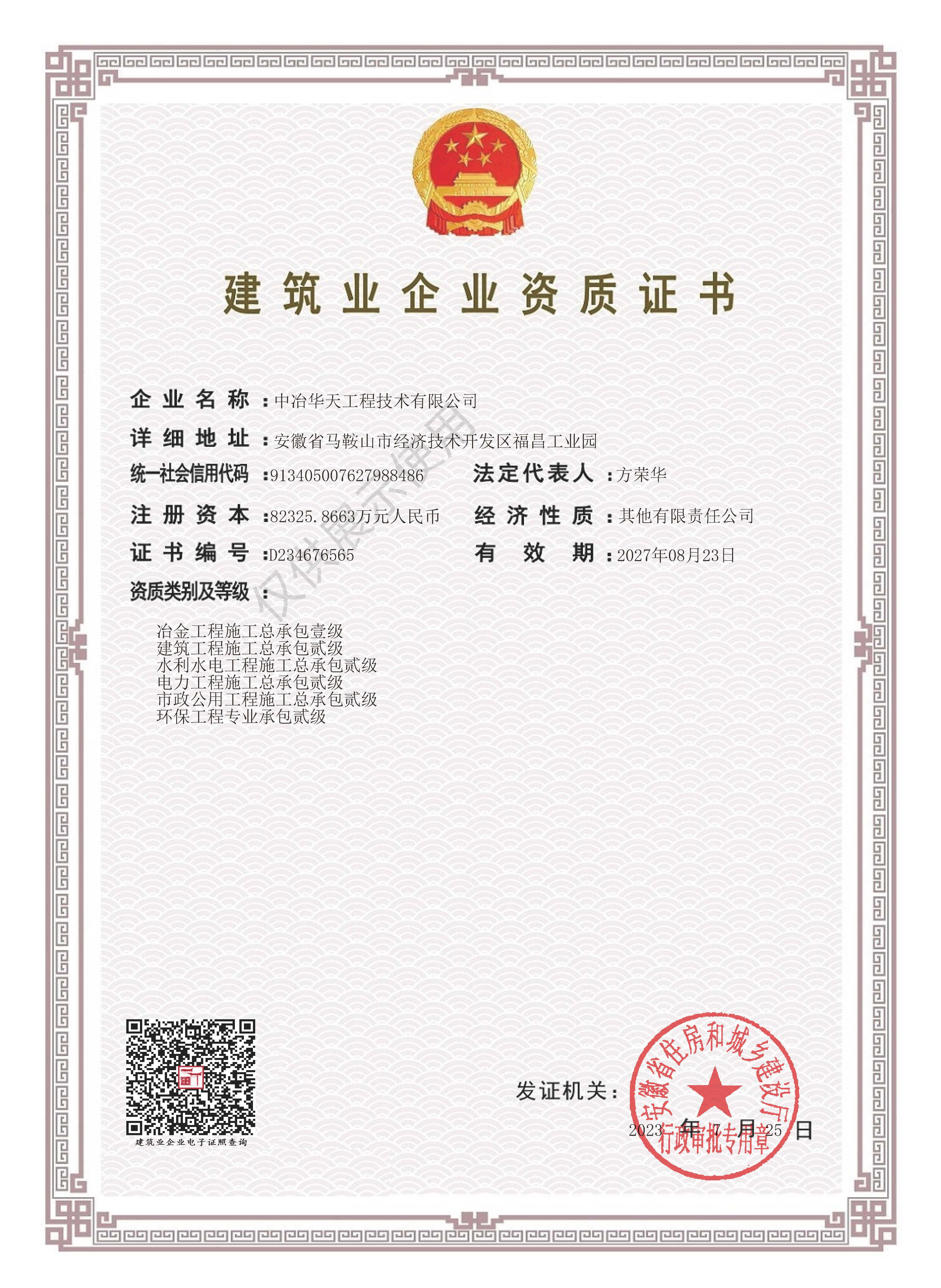 当前,中冶华天已经形成了以钢铁板块为主体,以房建市政和环境环保板块为两翼的“一体两翼”三大主营业务,全过程咨询工程监理、装备制造、新能源开发、数字化智能化服务等多极发展的业务体系。作为各项业务发展和市场开拓的必要条件,完备的资质体系是公司“一体两翼”多极发展业务体系长远发展的有效保障,“人无我有、人有我优”的资质条件是市场开拓的核心竞争力,中冶华天将持续加强资质体系建设,助力公司市场开发和综合实力提升,为公司绿色高质量发展赋能,持续擦亮“中冶华天 绿色明天”企业品牌!
