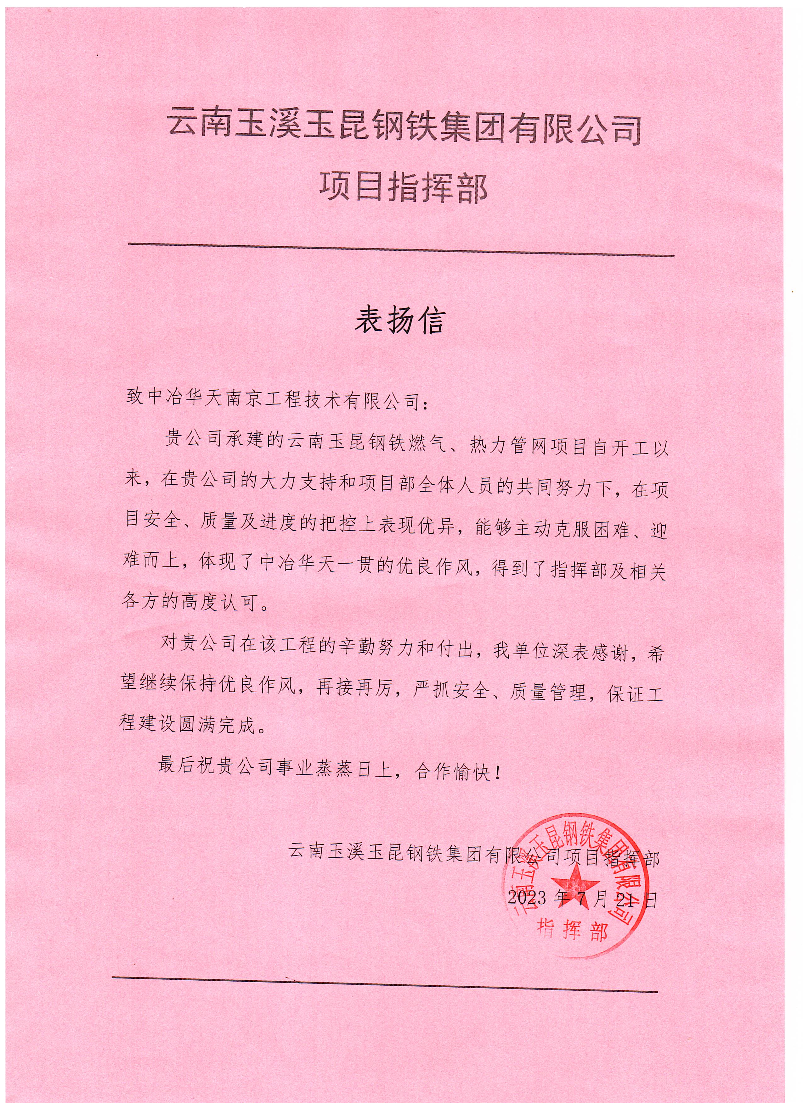 近日,中冶华天承建的云南玉昆钢铁燃气、热力管网总承包项目部收到业主方表扬信,信中盛赞全体项目人员在安全、质量及进度把控上的优异表现,对公司在工程上的辛勤付出表达高度认可与感谢,充分展现了公司的项目管控能力和一贯的优良作风,擦亮“中冶华天,绿色明天”品牌。