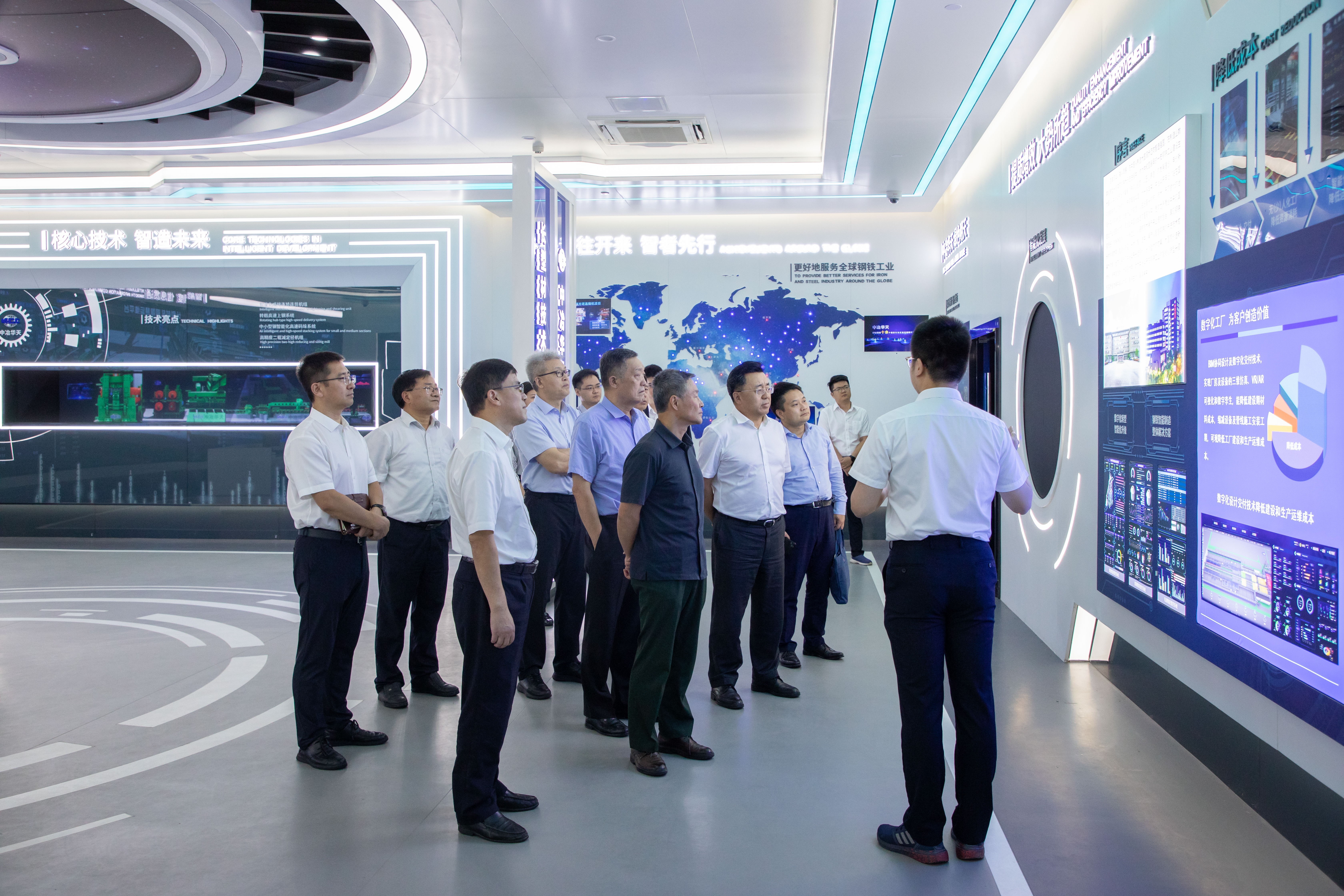 调研期间,外部董事一行参观了中冶华天马鞍山慈湖河综合治理项目、装备制造(中试)基地、数字化管控中心与长材智造中心,通过看现场、观展板、听讲解、提问题,详细了解水环境项目的治理技术、工艺与效果,自主科研成果的应用转化情况,以及数字化、智能化系统的运行情况。