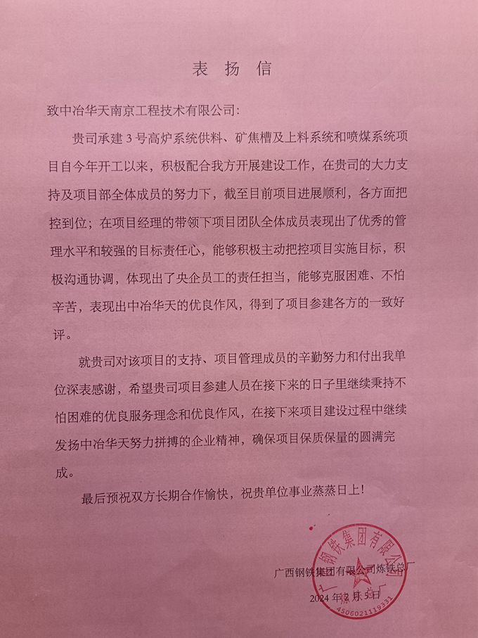 2月5日,广西钢铁集团公司炼铁厂发来表扬信,对中冶华天总承包的防城港钢铁基地3号高炉系统供料、矿焦槽及上料系统和喷煤项目的执行情况给予充分肯定,并对项目部成员的辛勤付出表示感谢,再次彰显了中冶华天高品质履约能力,持续擦亮“中冶华天,绿色明天”品牌。