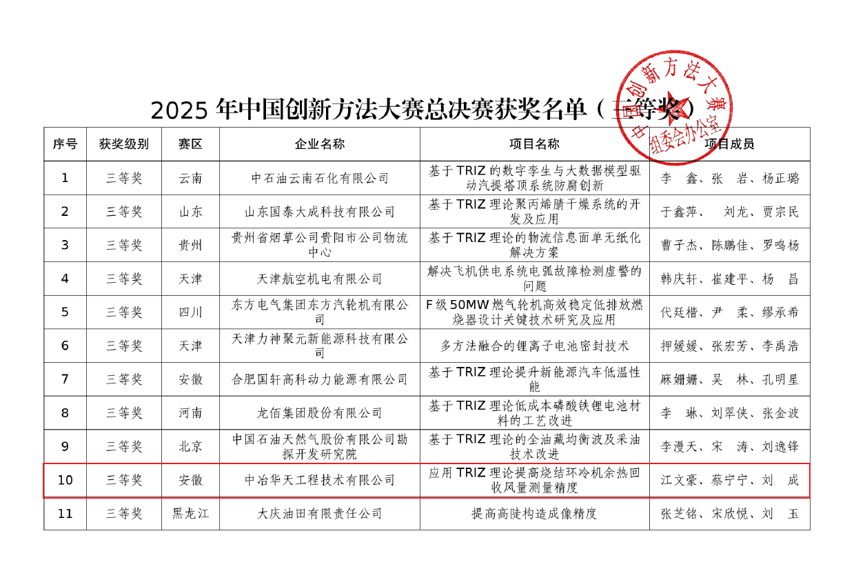 11月17日至21日,2025年中国创新方法大赛全国总决赛在山东泰安和济南举办,中冶华天参赛作品《应用TRIZ理论提高烧结环冷机余热回收风量测量精度》斩获三等奖,充分展现了华天积淀深厚的创新底蕴和华天员工昂扬奋进的创新风采。