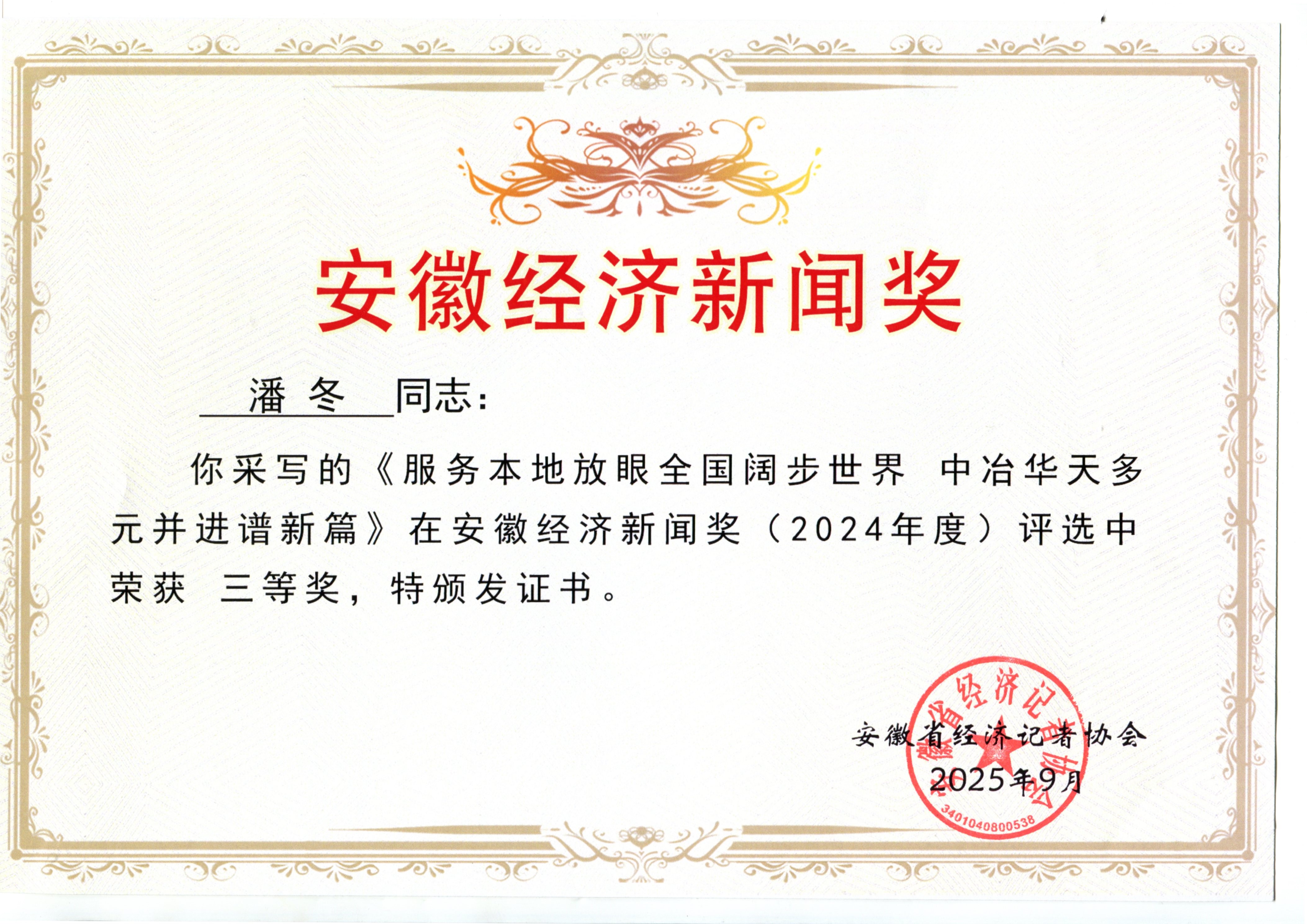 近日,中冶华天收到安徽省经济记者协会颁发的获奖证书,由公司党群工作部(党委宣传部)员工潘冬采写的新闻稿件《服务本地放眼全国阔步世界 中冶华天多元并进谱新篇》获评安徽经济新闻奖三等奖,有力彰显了公司推动再转型再升级的最新成绩和用心策划宣传的积极作为,是对其高质量发展实践与品牌传播成效的双重肯定。