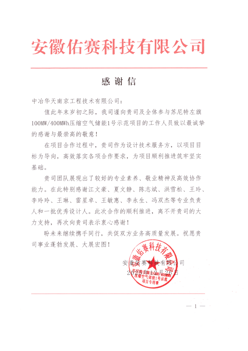 成立于2011年的佑赛科技是国家级专精特新“小巨人”企业,专注于压缩空气储能技术研发与应用,依托清华大学顶尖研发团队,长期致力于压缩空气储能的技术创新和产业协同,现已成为压缩空气储能行业的头部企业。此次收到佑赛科技发来的感谢信,是对中冶华天压缩空气储能团队成员的褒奖,将激励团队继续聚焦压缩空气储能、二氧化碳储能、熔盐储能等先进技术,加速科技成果转化,助力构建清洁低碳、安全高效的现代能源体系,为能源转型和产业升级贡献更多华天智慧和力量。