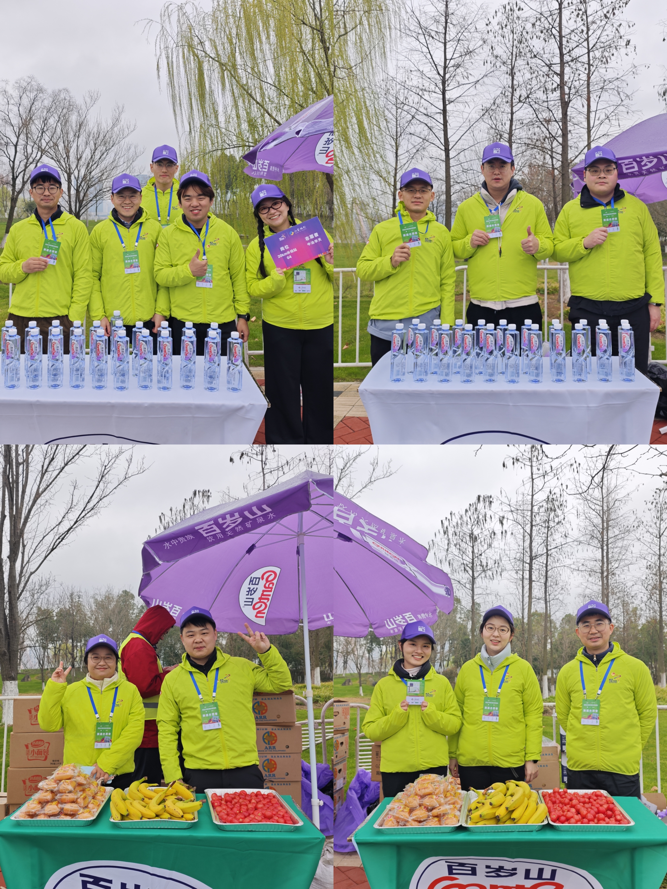 春寒料峭,细雨绵绵,华天青年热情不减!凌晨五点,路灯辉映下,志愿者小队早早收拾好装备,冒着低温、小雨和大风,集中乘车赶赴位于江心洲赛道20km点的志愿服务处,随即开展紧锣密鼓的准备工作。这支平均年龄三十岁出头的青年队伍有着丰富的志愿服务经验,在“半马”热烈氛围的感染下,更是干劲十足。志愿者们“兵分三路”,悉心分工配合。补给组依次运送和铺陈矿泉水、能量饮料、水果面包等物资,搭起一个个井然有序的临时补给点;喷淋组提前调试设备,准备为跑至终点有需求的选手进行降温;计时组则手持计时器,严阵以待。万事俱备,静待发令!