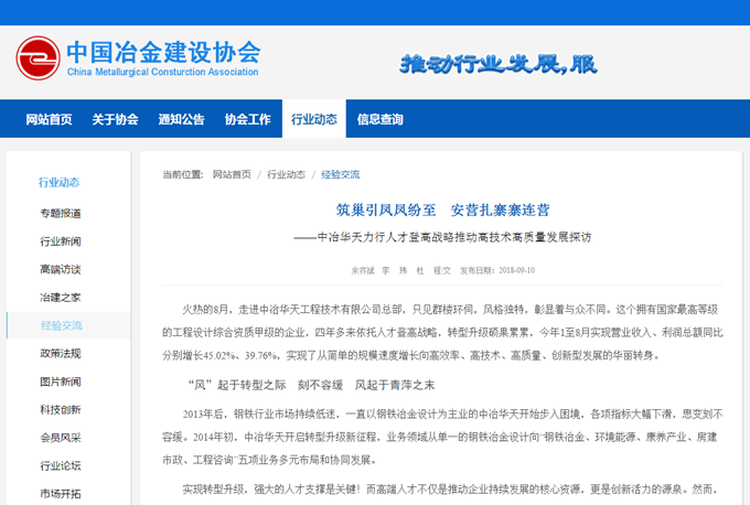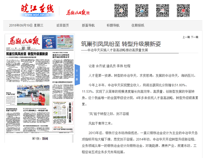 9月10日,中冶集团《中国冶金》第44期、中国冶建协会官网全文刊发了《筑巢引凤凤纷至 安营扎寨寨连营——中冶华天实施人才登高战略推动高质量发展》一文;9月19日,《马鞍山日报》头版头条以《筑巢引凤凤纷至 转型升级展新姿》为题全文刊登,马鞍山市委官网、马鞍山先锋网同名登载。