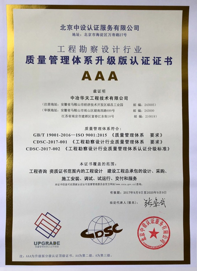 11月28日,国家认监委公布了“质量管理体系认证升级版”试点项目获证企业名单,中冶华天获得工程勘察设计行业质量管理体系升级版顶级(AAA)证书。该升级版顶级(AAA)证书的获得,是对中冶华天近年来致力于企业转型、可持续发展的顶层设计,大力完善和增强企业内部管控能力,持续创新企业文化,提升公司核心竞争力所付出的艰苦努力和所取得的优异成绩的认可与褒扬,为工程勘察设计类企业在全面加强内部管理,推动建立突出行业特色的质量管理体系认证上树立了标杆。