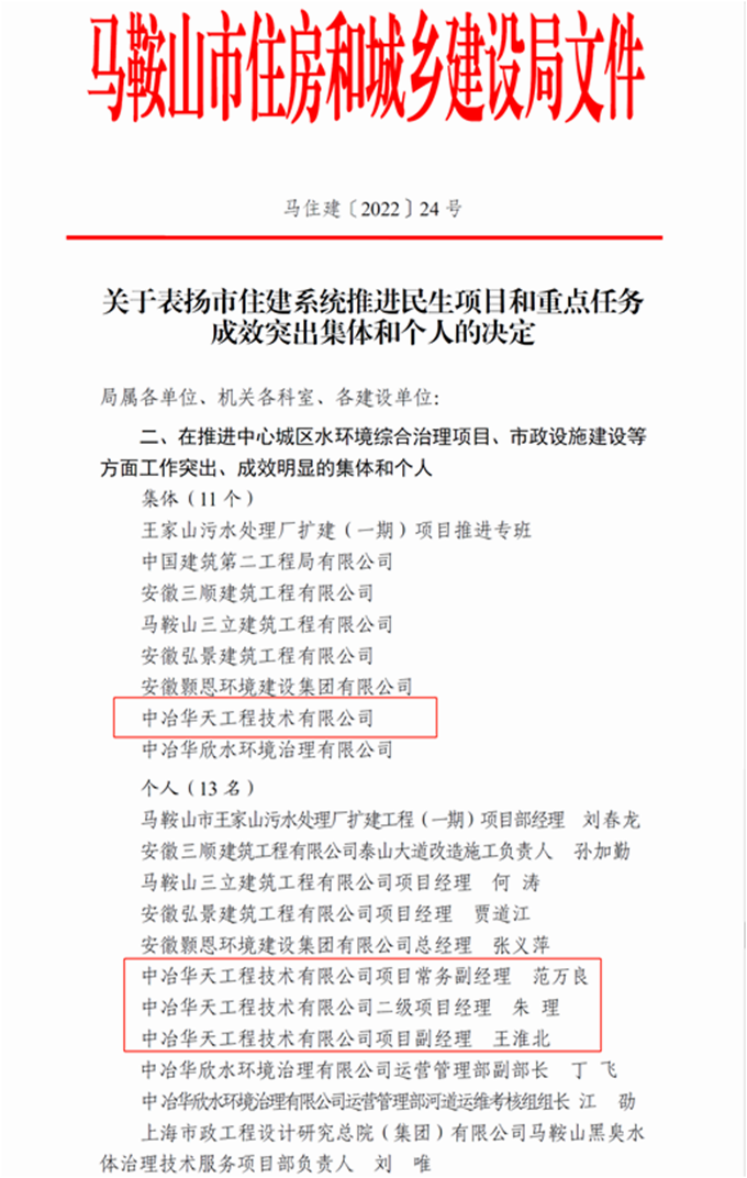 3月10日,马鞍山市住建局下发《关于表扬市住建系统推进民生项目和重点任务成效突出集团和个人的决定》,由于在推进中心城区水环境综合治理项目、市政设施建设等方面工作突出、成效明显,中冶华天工程技术有限公司被评为2021年推进民生项目和重点任务成效突出集体,范万良、朱理、王淮北等被评为2021年推进民生项目和重点任务成效突出个人,这是自2019年11月15日中冶华天马鞍山水环境综合治理PPP项目部被马鞍山市委、市政府评为“长江生态环境突出问题整改工作先进集体”后再获殊荣,展现了当地政府对该项目的高度认可,持续擦亮“中冶华天,绿色明天”品牌。